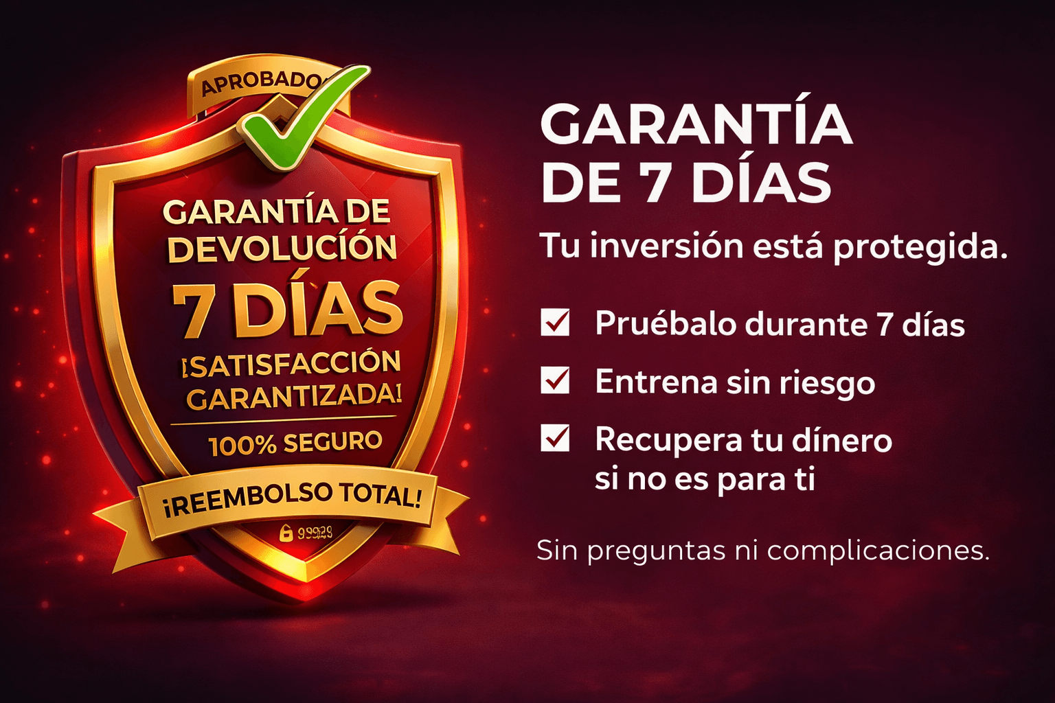 Estoy tan convencido de que la Guía Red Fighter Conditioning transformará tu resistencia en el combate, que te ofrezco una Garantía Blindada de 7 Días.